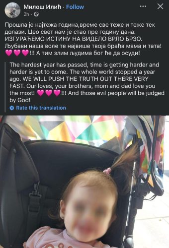 – Prošla je najteža godina, vreme sve teže i teže tek dolazi. Ceo svet nam je stao pre godinu dana. Izguraćemo istinu na videlo vrlo brzo. Ljubavi naša vole te najviše tvoja braća, mama i tata! A tim zlim ljudima Bog će da osudi! – napisao je Miloš Ilić, otac male Danke.