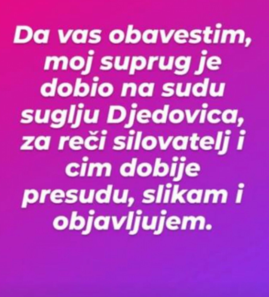 – Da vas obavestim moj suprug je dobio na sudu šuglju Đedovića za reči silovatelj i čim dobije presudu, slikam i objavljujem – glasila je objava na Marijinom profilu, a potom se nadovezala: