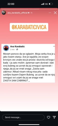 – Moram ponovo da se oglasim. Moja ćerka Ava je u jako lošem stanju .Sve je izgubila ‚ne svojom krivicom. Već znate sta je prošla i doživela od koga i kada. I ja zato molim, spreman sam donirati i dati svoj bubreg za uzvrat da joj omogući oporavak i njega, da joj se vrati snaga. Zaista sam zabrinut. Nikad nisam nikog ništa pita sada ozbiljno kažem. Dajem bubreg za uzvrat da se njoj omoguće svi uvjeti da joj se snaga vrati. ZAISTA SAM ZABRINUT -napisao je Ivica na svojoj društvenoj mreži.