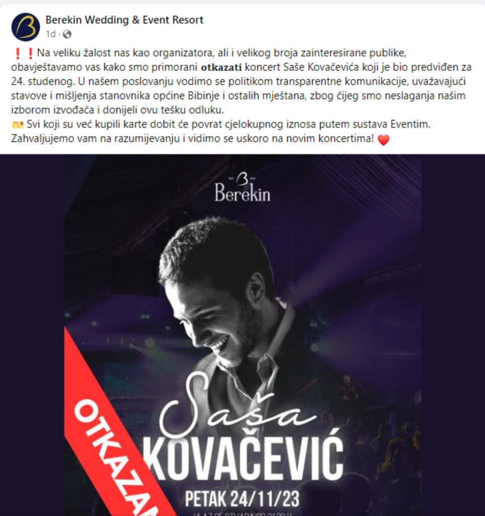 – Na veliku žalost nas kao organizatora, ali i velikog broja zainteresirane publike, obaveštavamo vas kako smo primorani da otkazažemo koncert Saše Kovačevića koji je bio predviđen za 24. oktobra – piše u objavi.
