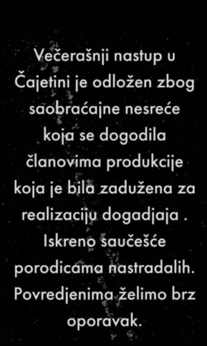 „Večerašnji nastup u Čajetini je odložen zbog saobraćane nesreće koja se dogodila članovima produkcije koja je bila zadužena za realizaciju događaja. Iskreno saučešće porodicama nastradalih“, piše u objavi na Fejsbuk stranici „Užice – oglasna tabla“ što je podelio i Sale Tropiko na svojoj Instagram stranici.