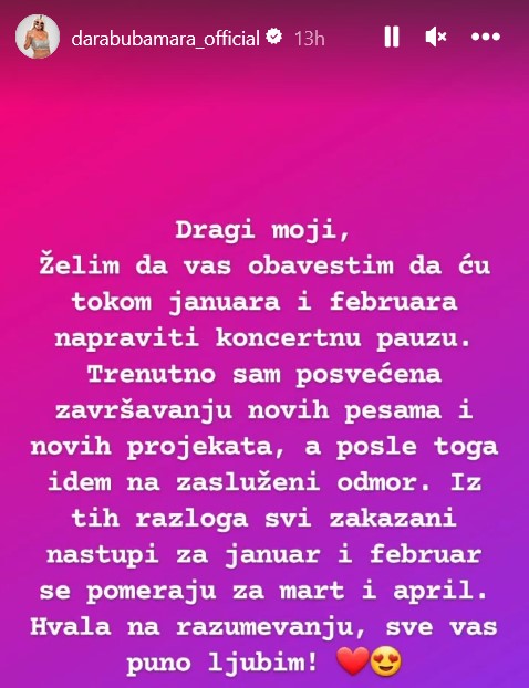 – Dragi moji, želim da vas obavestim da ću tokom januara i februara napraviti koncertnu pauzu. Trenutno sam posevćena završavanju novih pesama i novih projekata, a posle toga idem na zasluženi odmor – napisala je Dara i objavi na Instagramu.