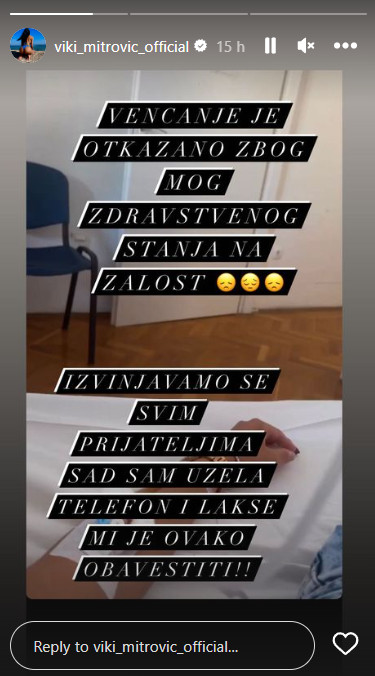 – Venčanje je otkazano zbog mog zdravstvenog stanja. Izvinjavamo se svim prijateljima, sad sam uzela telefon i lakše mi je ovako da vas obavestim – poručila je Viki.
