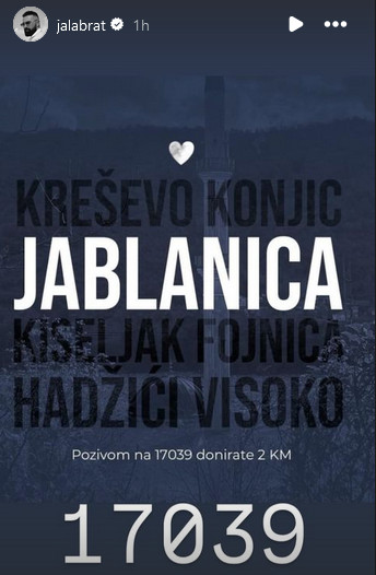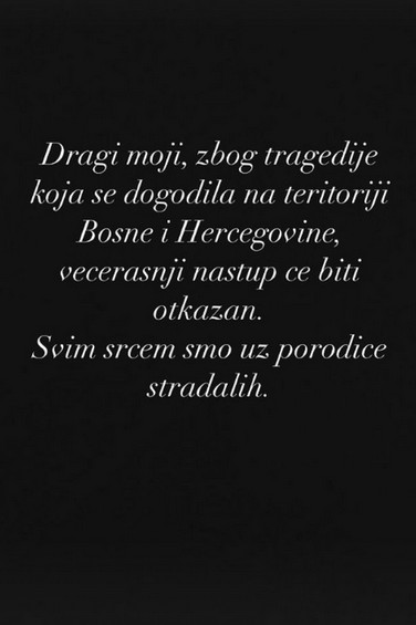 – Dragi moji, zbog tragedije koja se dogodila na teritoriji Bosne i Hercegovine. Večerašnji nastup će biti otkazan. Svim srcem smo uz porodice stradalih – napisala je ona na njenom Instagramu.