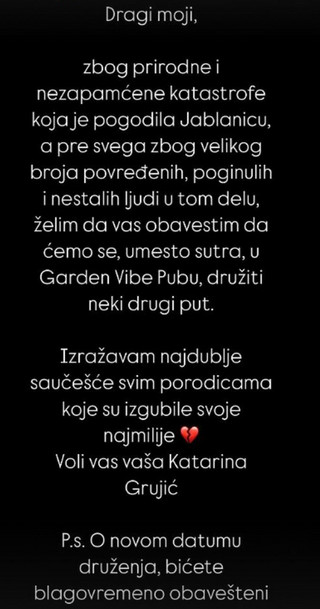 – Dragi moji, zbog prirodne i nezapamćene katastrofe, koja je pogodila Jablanicu, a pre svega zbog velikog broja povređenih, poginulih i nestalih ljudi u tom delu, želim da vas obavestim da ćemo se, umesto sutra, družiti neki drugi put – poručila je Katarina, a potom dodala: