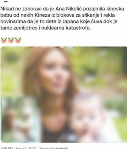 – Nikad ne zaboravi da je Ana Nikolić pozajmila kinesku bebu od nekih Kineza iz blokova za slikanje i rekla novinarima da je to dete iz Japana koje čuva dok je tamo zemljotres i nuklearna katastrofa – piše jedan korisnik pomenute društvene mreže, koji je i pokrenuo veliki broj komentara mahom i dalje začuđenih ljudi.