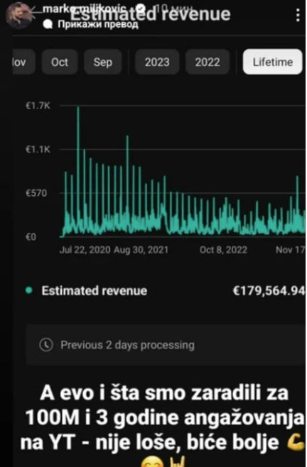 – A evo i šta smo zaradili za 100 miliona i 3 godine angažovanja na YouTube-u – nije loše, biće bolje. Hvala najjači naši – napisao je Marko pre godinu dana na svom Instagram profilu i postavio statisku gledanja videa, a koliko su još od tada zaradili za sada nije poznato.