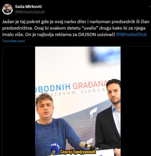 „Jadan je taj pokret gde je ovaj narko diler i narkoman predsednik ili član predsedništva. Ovaj bi svakom detetu “uvalio” drogu kako bi za njega imalo više. On je najbolja reklama za DAJSON usisivač“, napisao je Mirković na društvenoj mreži X.
