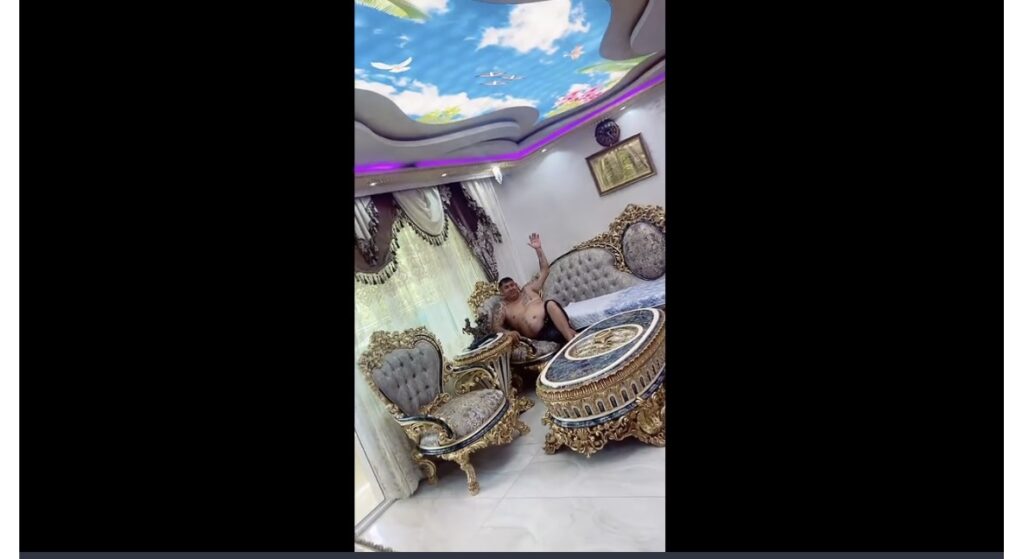 U snimcima je pokazao svaki kutak svog „kič“ doma. Prošetao je kroz svoju trepezariju, u kojoj svaka stolica, kao i sto, imaju ukrasne radove, dok su zavese takođe upečatljivo plave, a uz to, sve vreme se prskao parfemom.