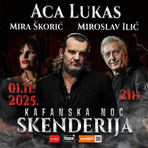 Trio koji obećava Aca Lukas, Mira Škorić i Miroslav Ilić poznati su za stvaranje sjajne atmosfere. Po prvi put nastupiće zajedno na istoj bini! Kafanska noć u Skenderiji biće sve osim obične. Emotivna, energična, glasna i raspevana. Baš kakva i treba da bude!