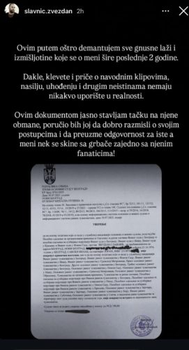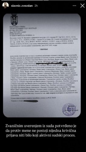 Naime, Zvezdam je na svom Instagram profilu podelio zvaničan sudski dokument koji potvrđuje da protiv njega ne postoji nijedna krivična prijava niti bilo koji aktivni sudski proces, te se javno obratio Anđeli Đuričić koja je širila laži o njemu tokom rijalitija ali i nakon izlaska.