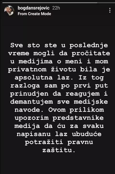 – Sve što ste u poslednje vreme mogli da pročitate u medijma o meni i mom privatnom životu bila je apsolutna laž. Iz tog razloga sam po prvi put prinuđen da reagujem i demantujem sve medijske navode – napisao je Bogdan na svom Instagram profilu: