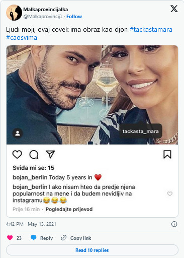 Tačkasta Mara je redovno na svojim društvenim mrežama delila slike dok je bila u ljubavi sa Bojanom, a jednom prilikom mu se obratila emotivnim rečima: