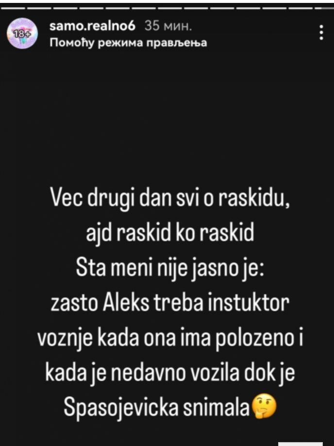 – Već drugi dan svi o raskidu, ajde raskid kao raskid. Šta meni nije jasno je: Zašto Aleks treba instruktor vožnje kada ona ima položeno i kada je nedavno vozila dok je Spasojevićka snimala.