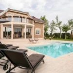 Oko bazena su postavljene ležaljke i fotelje, a vila poseduje dve velike dnevne sobe u kojima se nalaze unikatne garniture, veliki televizor, a zidovi su svetlih boja.