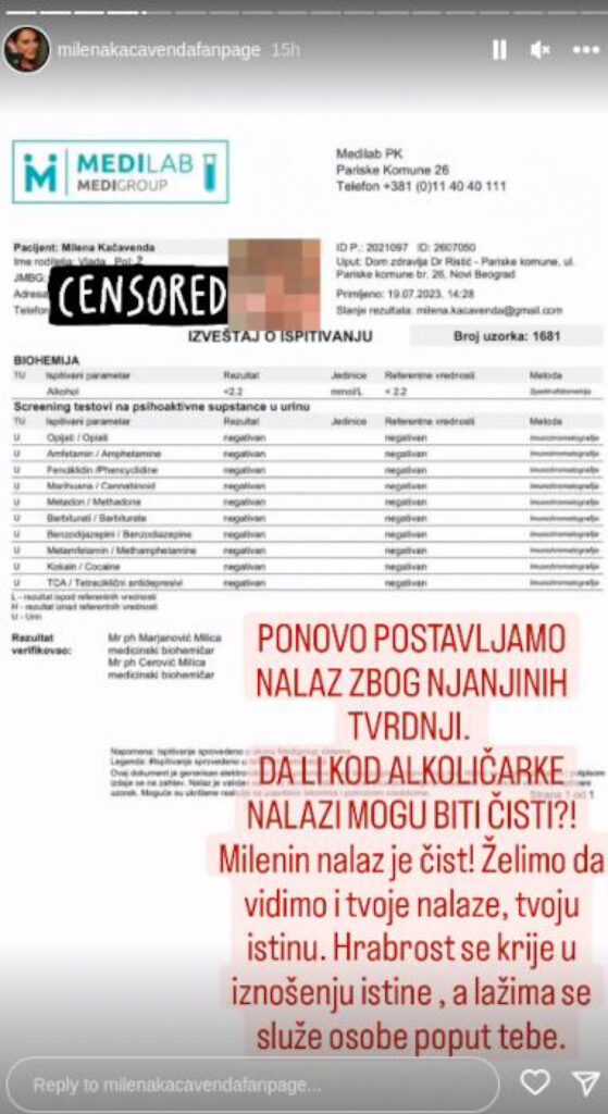– Ponovo postavljamo nalaz zbog Njanjinih (Ana Ćurčić) tvrdnji! Da li kod alkoholičarke nalazi mogu biti čisti?! Milenin nalaz je čist! Želimo da vidimo i tvoje nalaze, tvoju istinu! Hrabrost se krije u iznošenju istine, a lažima se služe osobe poput tebe – stoji u saopštenju.