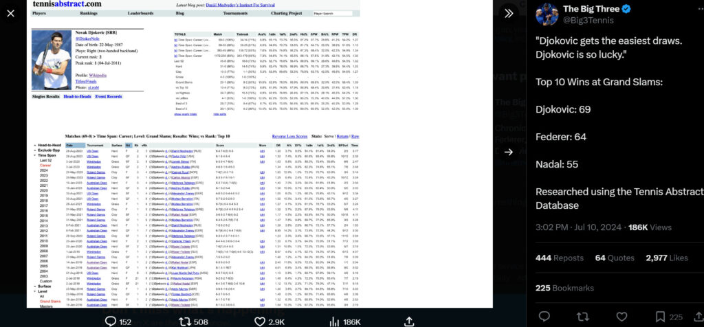 Prema objavi na jednom Iks profilu, možemo da vidimo kako Đoković od „velike trojke“ ima najviše pobeda nad top 10 igračima – čak 69. Iza njega su Rodžer Federer sa 64, a Rafael Nadal ima 55 trijumfa.