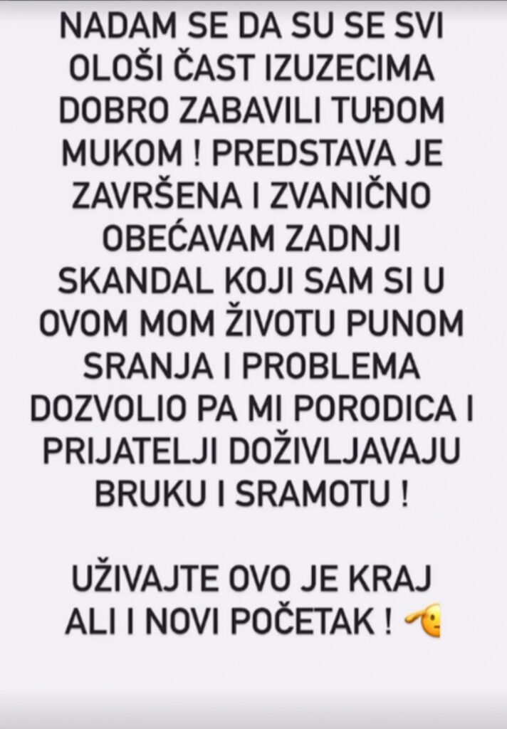 – Nadam se da su se svi ološi, čast izuzecima, dobro zabavili tuđom mukom. Predstava je završena i zvanično obećavam zadnji skandal koji sam u ovom mom životu punom sr*nja i problema dozvolio pa mi porodica i prijatelji doživljavaju bruku i sramotu. Uživajte, ovo je kraj, ali i nov početak – napisao je Filip.