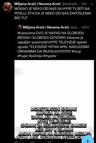 “Ovo je napad na slobodu medija i slobodu govora. Večeras je zapaljen automobil Hype televizije ispred zgrade televizije. HITAN APEL NADLEŽNIM ORGANIMA DA REAGUJU”, glasi početak njihovog obraćanja na mreži Iks.