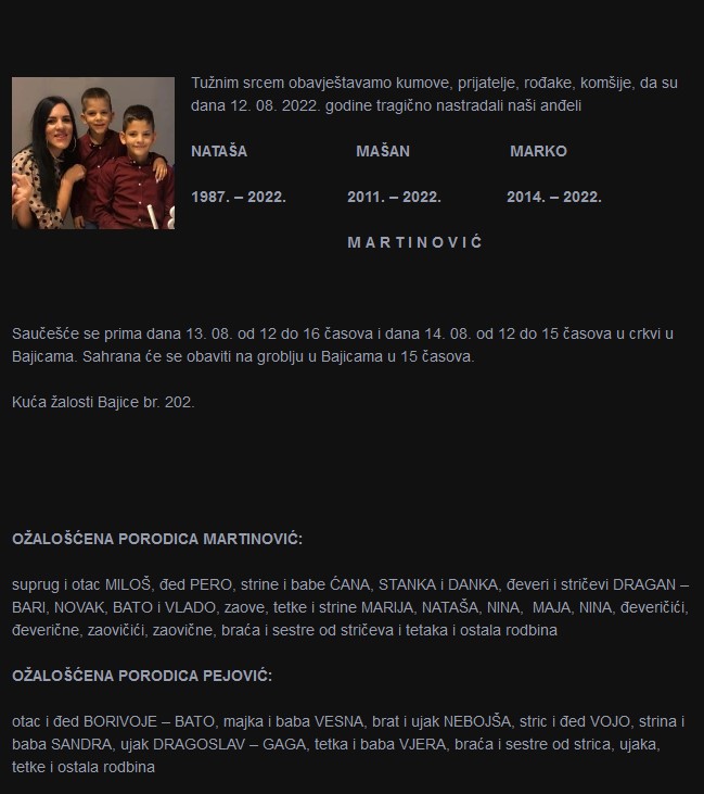 Među žrtvama masovnog ubice sa Cetinja našli su se medicinska sestra Nataša Pajović Martinović i njena dva sina – jedanaestogodišnji Marko i tri godine mlađi Mašan.