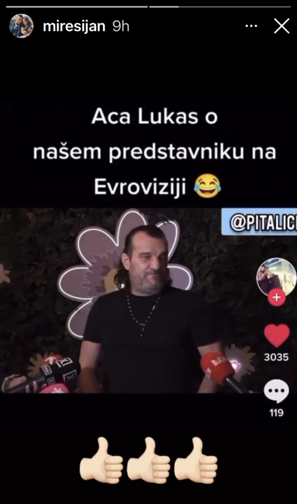 Naime, Mirko je objavio snimak Ace Lukasa koji je dao svoj komentar na pesmu „Samo mi se spava“ i našeg predstavnika na ovogodišnjem takmičenju, Luku Bleka. Lukas je izneo svoje mišljenje koje nije baš bilo pozitivno, ali se Mirko složio sa njim emotikonima lajka.