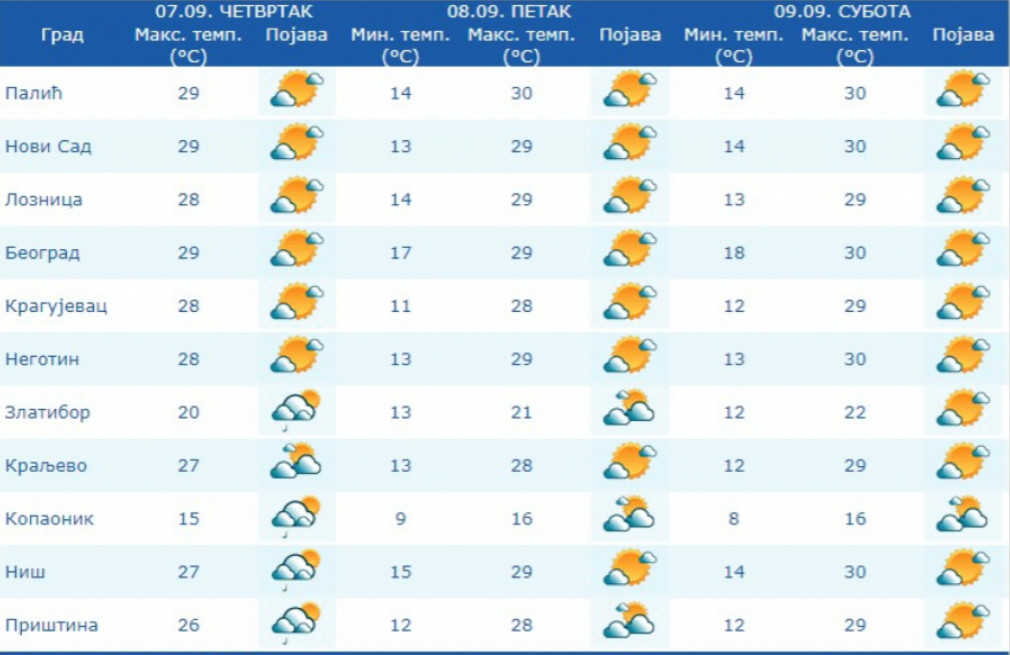 U Beogradu će biti pretežno sunčano i toplo. Vetar slab i umeren, istočni i jugoistočni. Najniža temperatura od 14 do 17 C, a najviša dnevna oko 29 C.