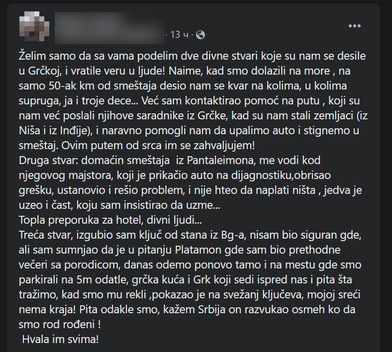 „Želim samo da sa vama podelim dve divne stvari koje su nam se desile u Grčkoj. I vratile veru u ljude! Kad smo dolazili na more, na samo 50 kilometara od smeštaja desio nam se kvar na kolima. U kolima smo bili supruga, troje dece i ja… „