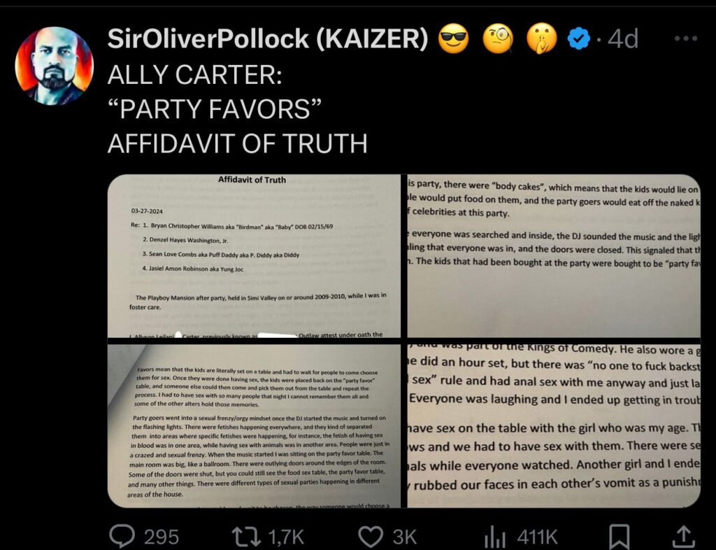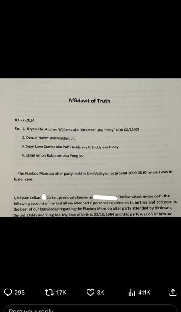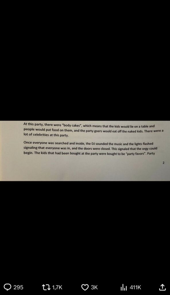 Sada je na društvenoj mreži X isplivao skandalozan dokument „Izjava o istni“, u kojem, navodno, određena Alison Lejlani govori o jednoj takvoj žurci koja se održala u Plejboj Vili u Simi dolini, a na kojoj je, među mnogim poznatim licima, bio i Paf Didi!