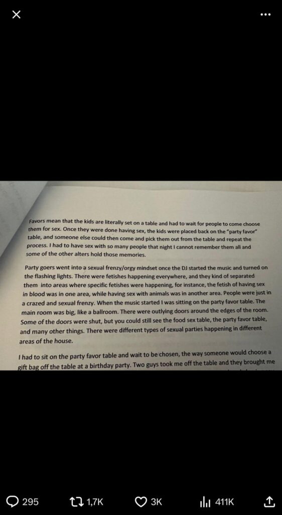 Blagodati znače da su deca bukvalno postavljena na sto. Morala su da čekaju da ljudi dođu da ih izaberu za s*ks. Kada su završili sa s*ksom, deca su ponovo stavljena na sto za „uslugu za žurku“, a neko drugi je mogao da dođe i uzme ih sa stola i ponovi proces. Morala sam da imam s*ks sa toliko ljudi te noći da ne mogu da ih se setim svih, a neki drugi alteri čuvaju ta sećanja.