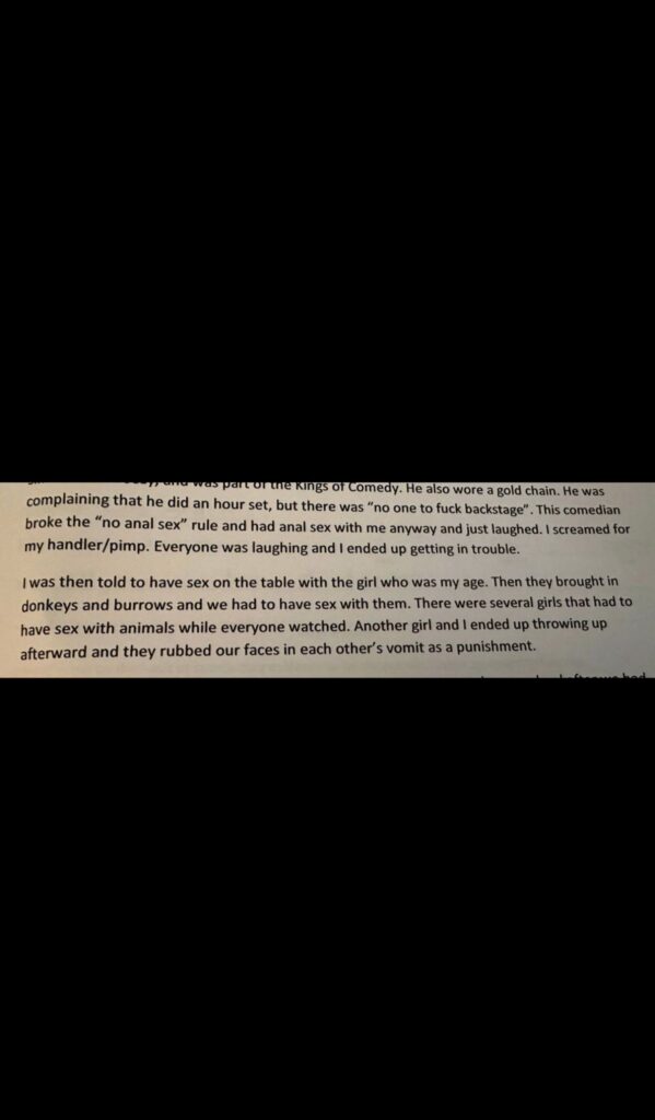 Tada mi je rečeno da imam s*ks za stolom sa devojkom koja je bila mojih godina. Onda su doveli magarce i životinje i morali smo da imamo s*ks sa njima. Bilo je nekoliko devojaka koje su morale da imaju s*ks sa životinjama dok su sve gledale. Druga devojka i ja smo na kraju krenule da povraćamo i oni su nam za kaznu trljali lica u povraćku.