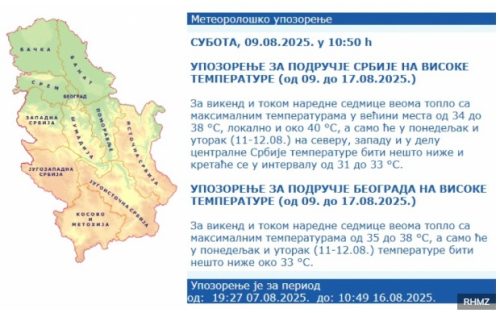 Lokalno će biti i oko 40, a samo će u ponedeljak i utorak (11-12. avgusta) na severu, zapadu i u delu centralne Srbije temperature biti nešto niže i kretaće se u intervalu od 31 do 33, navodi se u upozorenju RHMZ-a.