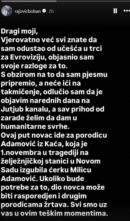 – Dragi moji, verovatno već znate da sam odustao od učešća u trci za Evroviziju, objasnio sam svoje razloge za to. S obzirom da sam pesmu pripremio, a neće ići na takmičenje, odlučio sam da je objavim narednih dana na jutjub kanalu. Sav prihod od zarade želim da dam u humanitarne svrhe. Ovaj put novac ide za porodicu Ademović iz Kaća, koja je 1. novembra u tragediji na železničkoj stanici u Novom Sadu izgubila ćerku Milicu Adamović. Ukoliko bude potrebe za to, dio novca može biti raspodeljen i drugim porodicama žrtava. Svi smo uz vas u ovim teškim momentima – napisao je Boban na svom Instagram profilu.
