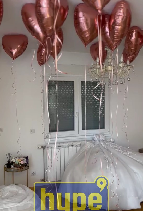 Ono što smo prvo zapazili jeste dekoracija u odaji u kojoj se mlada oblači i priprema za svoj najvažniji dan u životu. Ona je želela da cela prostorija bude ispunjena balonima u obliku srca. Pevačica je izabrala belu venčanicu, na tanke bretele, a gornji deo haljine nalik na korset presvučen je čipkom, dok se haljina od struka širi u princeza haljinu.