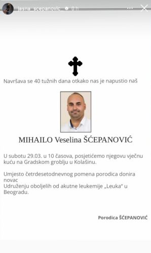 – U subotu 29.03. u 10 časova, podsetićemo njegovu večnu kuću na Gradskom grobolju u Kolašinu. Umesto četrdesetodnevnog pomena porodica donira novac Udruženju obolelih od akutne leukemije „Leuka“ u Beogradu – glasila je objava koju je Jasna podelila na svom Instagram profilu.