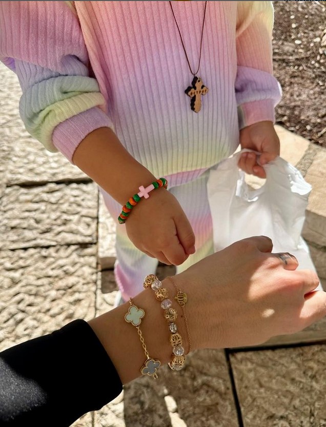 Tata i mama su joj dali da bira šta želi da joj kupe, a devojčica se opredelila za drveni krstić koji je odmah okačila oko vrata. Dok je dečiju brojanicu napravljenu u njenim omiljenim tonovima stavila na ruku. I pevačica je sebi kupila brojanicu i to baš u svom stilu. U zlatno srebrnim tonovima. A majka i ćerka su to ovekovečile jednom slikom.