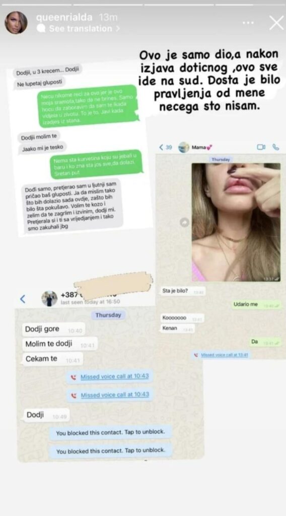 Rialda nije želela da ispadne žrtva niti kako kaže jadnica, ali ipak je dokumentovala sve fotografijom koju je tada objavila u javnost gde su joj usne bile rascepane od udarca. Posle toga izjavila je da je upravo Kenan mrtav za nju. Ova ljubav se neslavno završila i sada svako vodi svoje živote posebno.