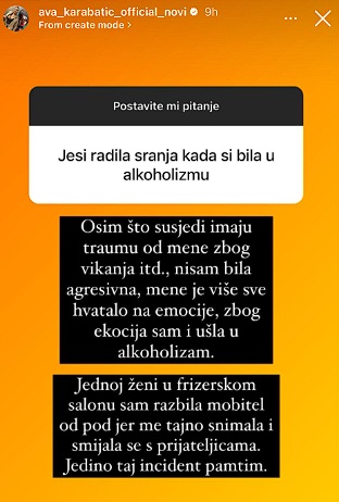 Po mnogima dobro poznata po svom živopisnom životu, starleta Ava Karabatić nedavno je progovorila o svojoj borbi s alkoholizmom. Nakon meseci medijskih spekulacija o njenom boravku na klinici za lečenje od alkoholizma, Ava se hrabro suočila s javnošću i priznala svoj problem.