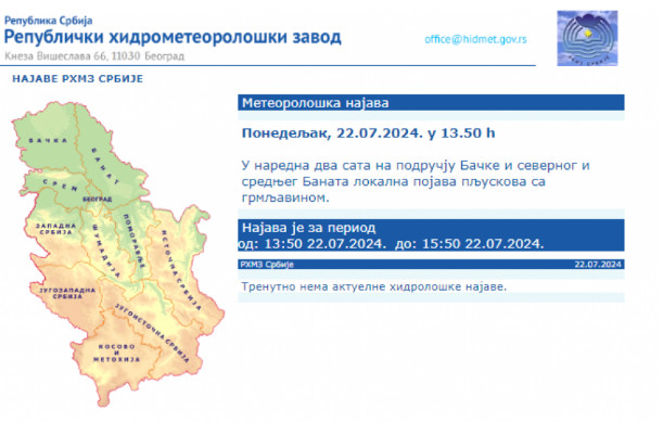 Sutra će situacija biti slična, s tim što će žuto upozorenje na grmljavinu važiti i u istočnoj Srbiji. Upozorenje na pljuskove odnosi se samo na jugoistočnu Srbiju.