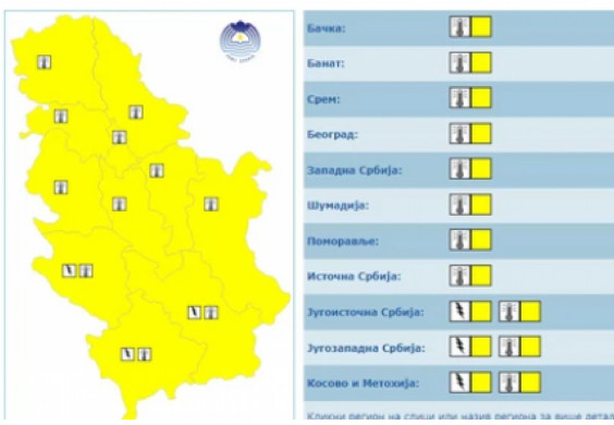 Žuto upozorenje na vrućine na snazi je danas u celoj Srbiji. Ipak, žuto upozorenje zbog grmljavine na snazi je u sledećim delovima zemlje: