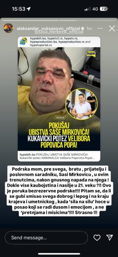 “Ma šta pričate? Znate li za detalje? Pojma nemam tog lika, ali šokirali ste me. Juče sam se čuo sa Sašom, dogovorili smo se da se u ponedeljak vidimo. Ako bilo kakav kontakt imate sa njim, prenesite mu da želim da se te rane saniraju”, izjavio je pevač.