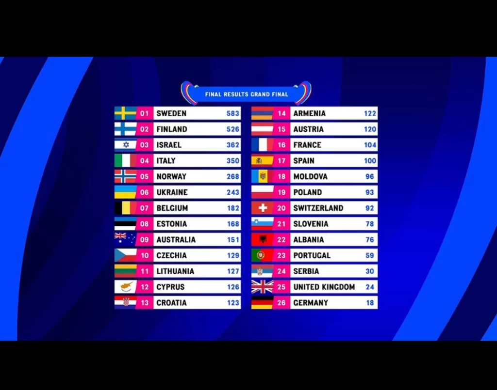 Posle Lorin, najviše poena žiri je dao Izraelki Noi Kirel koja je nastupala sa pesmom „Unicorn“, tačnije 177. Finac Karija, čiju su pobedu mnogi priželjkivali, od žirija je dobio „samo“ 150 poena. Publika mu je dala čak 376 poena, dok je Lorin dobila mnogo manje, 243 poena od publike, čime je bio apsolutni favorit publike.