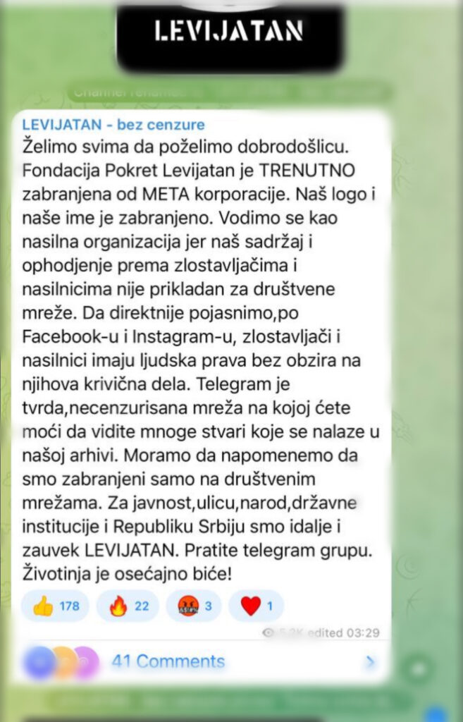 “Fondacija Pokret Levijatan je TRENUTNO zabranjena od META korporacije. Nas logo i nase ime je zabranjeno. Vodimo se kao nasilna organizacija jer nas sadrzaj i ophodjenje prema zlostavljacima i nasilnicima nije prikladan za drustvene mreze.” pisalo je na početku ljutite objave uz nastavak: