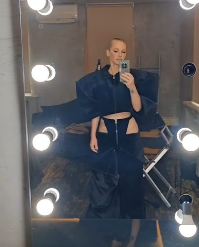 Uz ovaj neobičan i smeli stajling, pevačica je kosu podigla u elegantnu punđu, dok je šminku u potpunosti uskladila sa scenskim izgledom.