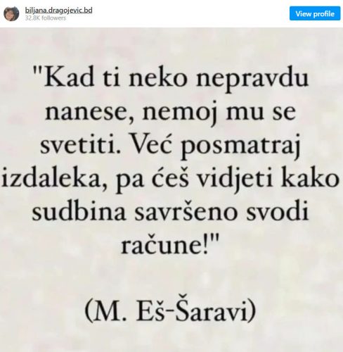 -Kada ti neko nepravdu nanese, nemoj mu se svetiti, već posmatraj izdaleka, pa ćeš videti kako sudbina savršeno svodi račune – glasio je citat koji je podelila Biljana, uz svoj komentar:“Ko prati, ima živi primer svaki dan. Karma je čudo“.