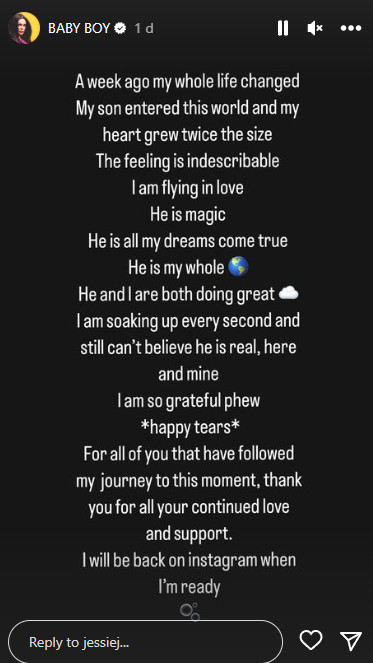 – Sa njim su ostvareni svi moji snovi. Pre nedelju dana ceo moj život se promenio. Moj sin je ušao na ovaj svet i srce mi je poraslo duplo. Osećaj je neopisiv – napisala je ona.