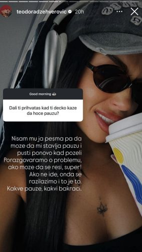 „Nisam mu ja pesma pa da može da mi stavlja pauzu i pusti ponovo kad poželi. Porazgovaramo o problemu, ako može da se reši, super. Ako ne ide, onda se razilazimo i to je to. Kakve pauze, kakvi barači“, napisala je Teodora.