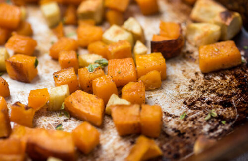 – Hrskavi batat krompir pečen u rerni, začinjen maslinovim uljem i svežim ruzmarinom.