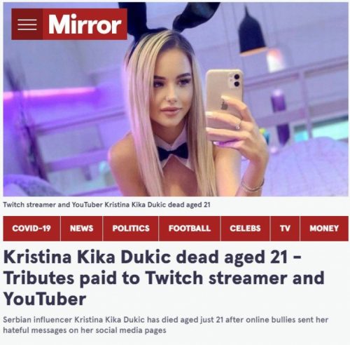 Kristina Kika Đukić ubila se u iznajmljenom stanu u Beogradu, a vest o njenom samoubistvu šokirala je ceo region, a danas se vest o tragičnom događaju našla i na britanskom portalu Mirror.