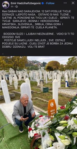 „Rani SABAH nad Sarajevom, 12 sati posle tvoje dženaze lepoto naša. Ostavio si nas tužne, setne, al ponosne na tvoj lik i delo. Isprati te tvoje Sarajevo , Bosna i Hercegovina, Hrvatska, Slovenija, Srbija, Crna Gora i Makedonija. Isprati te cela planeta….“