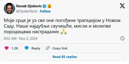 – Moje srce je uz sve one pogođene tragedijom u Novom Sadu. Naše najdublje saučešće, misli i molitve porodicama nastradalih – napisao je Novak.